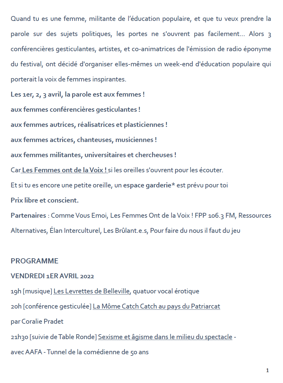 La première édition du festival Les Femmes Ont de la Voix ! se tiendra les 1,2,3 avril 2022 à Comme Vous Emoi, à Montreuil (métro Robespierre)