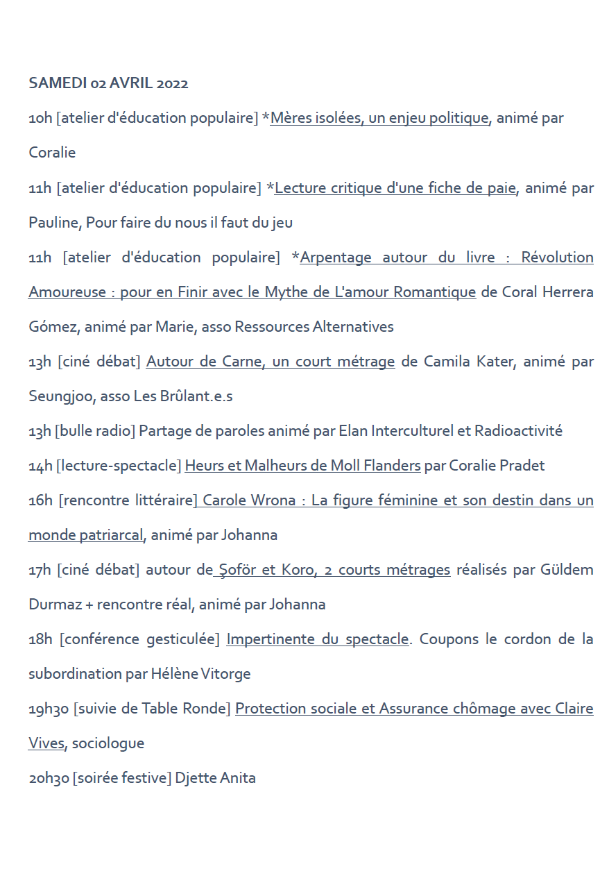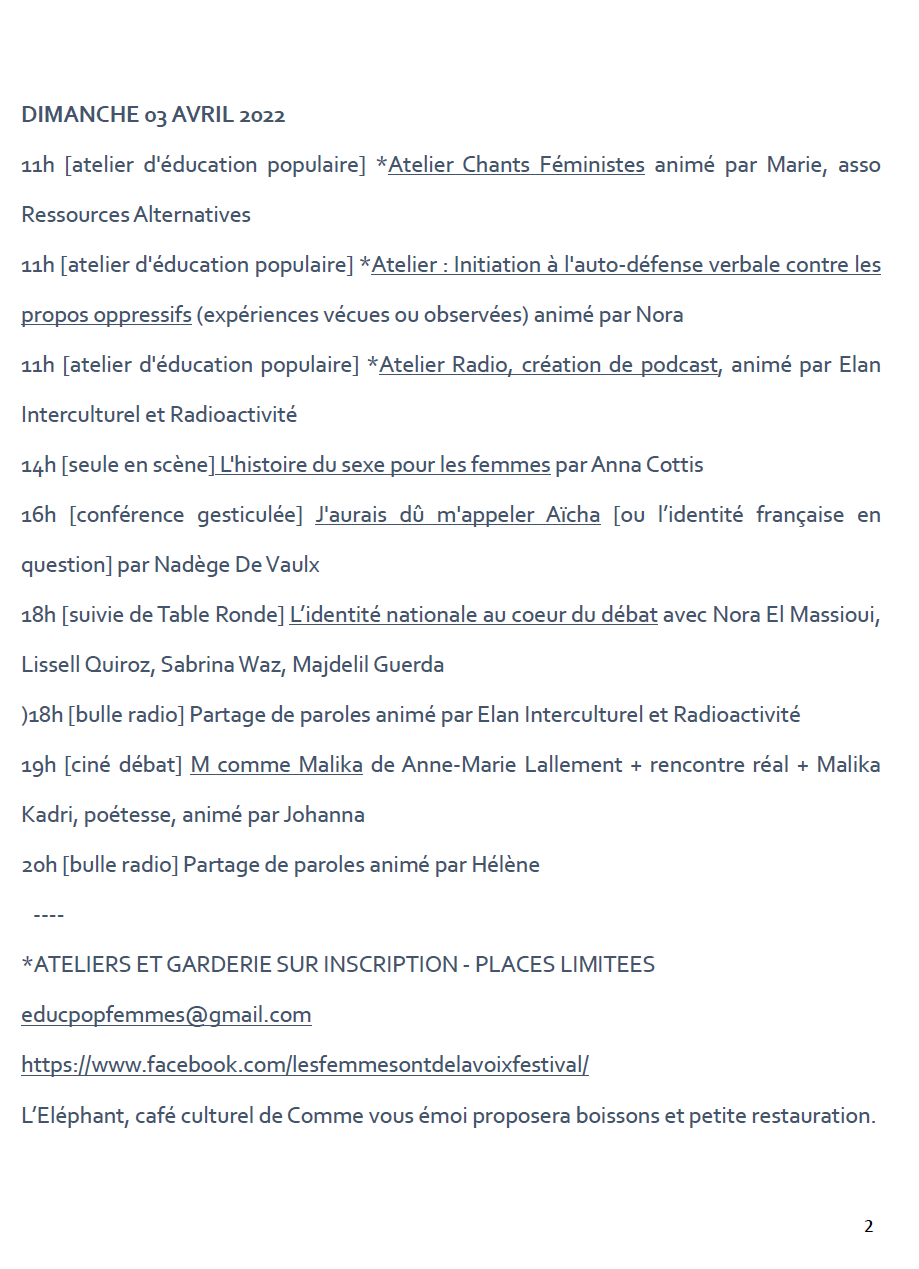 A noter : pour participer aux ateliers d’éduc pop, il est impératif de réserver par mail car les jauges sont limitées. [educpopfemmes@gmail.com].
