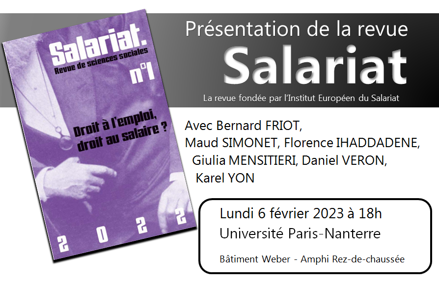 Rendez-vous le lundi 6 février à l’université Paris Nanterre, dans l’amphi au rez-de-chaussée du bâtiment Weber, pour une réunion publique à 18h autour du premier numéro de la revue Salariat.