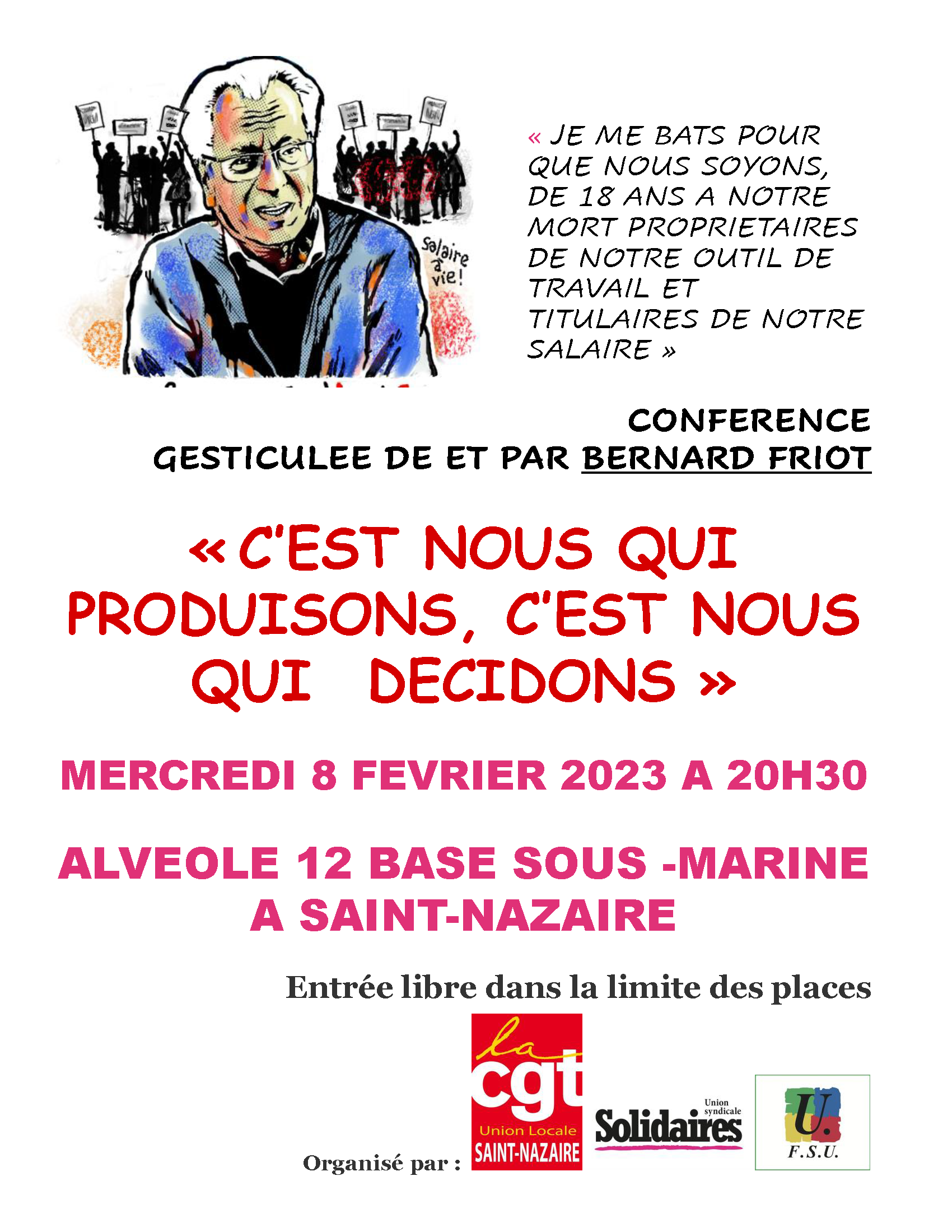 La CGT, FSU et Solidaires vous invitent le mercredi 8 février à l’Alvéole 12 de Saint-Nazaire (à côté de la base sous-marine) à assister à la conférence-gesticulée de Bernard Friot “Je veux décider du travail jusqu’à ma mort” :