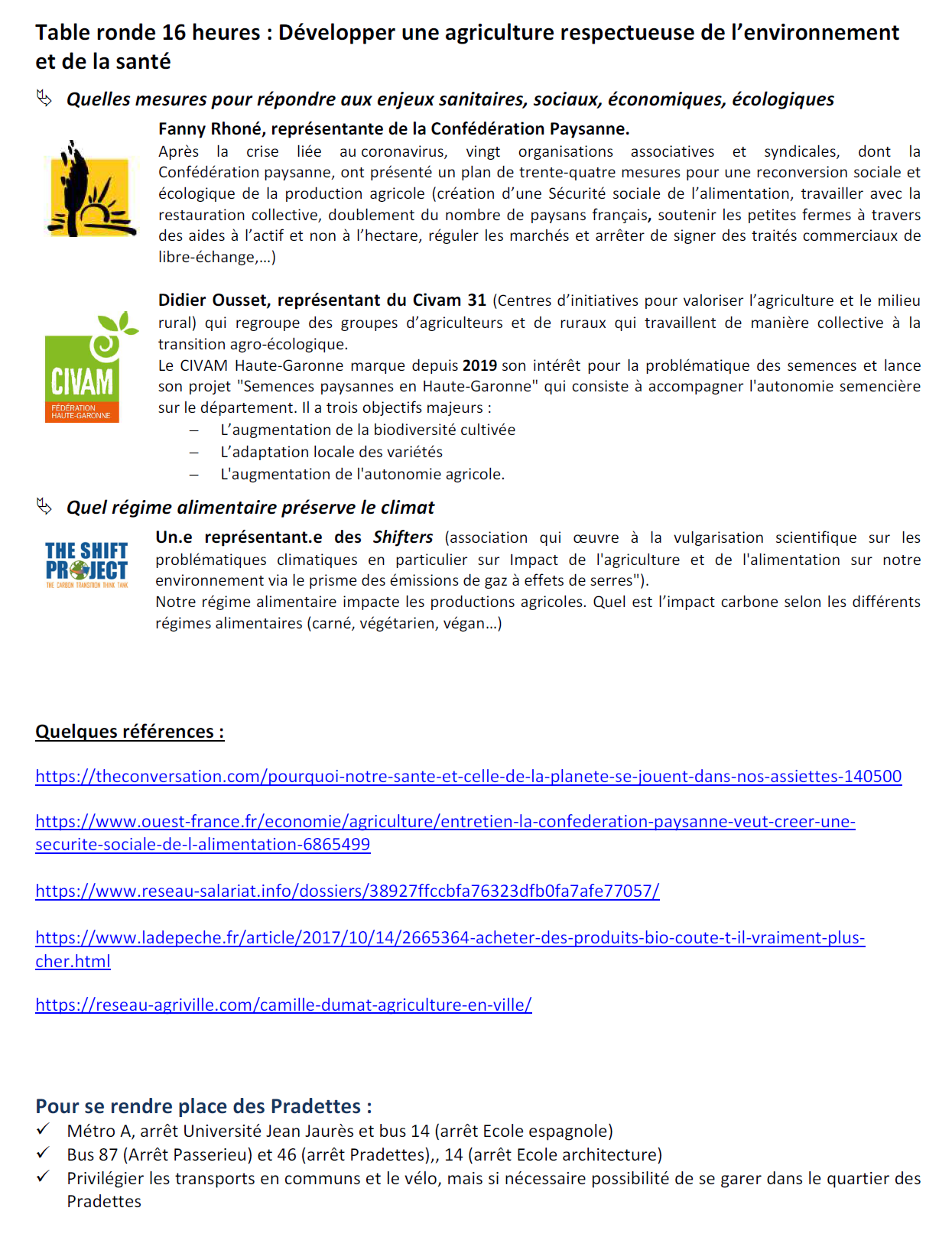 | Organisateurs | Les 48h de l'agriculture urbaine CPIE Terres Toulousaines Alternatiba Toulouse Collectif des Associations des Pradettes |